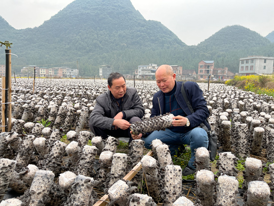 3月29日,环江毛南族自治县明伦镇吉祥村环江鑫发食用菌农民专业合作社生产示范基地,该县农业农村局农技人员正在指导农民云耳栽培技术。