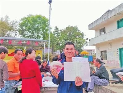 ▲大岭乡村心村大李巷屯群众领到土地租赁金露出开心的笑容。