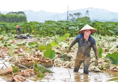 ▲大岭乡江兴村的莲藕种植基地喜获丰收。