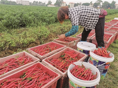 4月20日上午,记者在合浦县闸口镇庆丰村采访时看到,一望无际的辣椒田里,工人正弯腰低头采摘辣椒,田间地头一派忙碌景象。合浦县两岸红乡村振兴合作基地项目种植的近500亩辣椒当天开采。