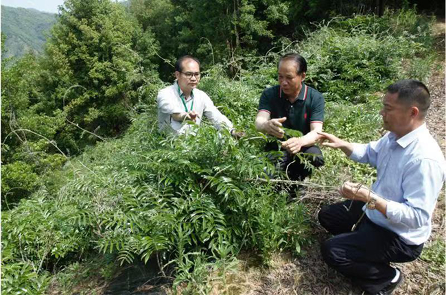 刘汉全(中)在向林业部门专家介绍牛大力的生长情况。