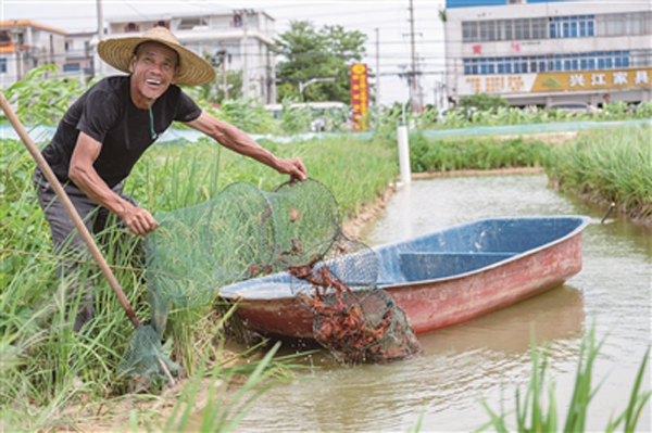 日前,在党江镇亚桥村“水稻+反季节小龙虾”项目投苗现场,工人在养殖沟里拖起一网网活蹦乱跳的小龙虾。虾苗被技术人员和工人们投放到指定区域。