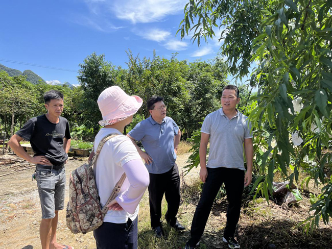 桂林市农业农村局总农艺师刘永忠(右一)到九屋镇察看鹰嘴桃生产情况