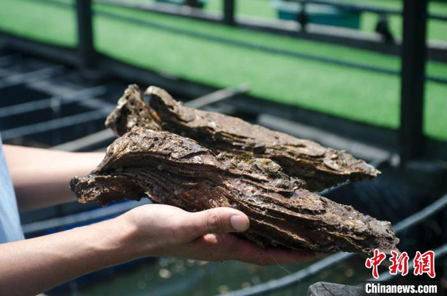 在钦州大蚝(核心)示范区,工作人员展示养了数年的大蚝。
