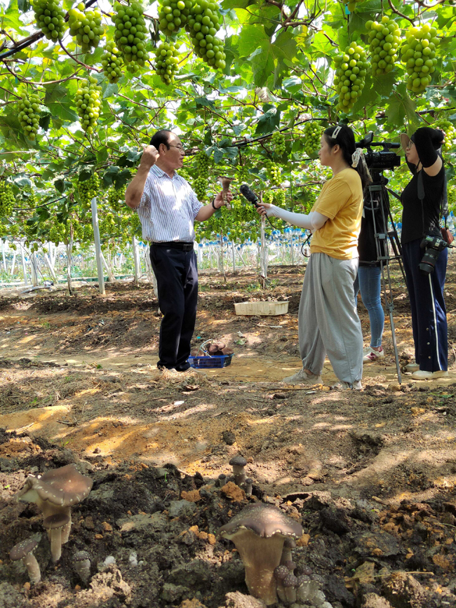 灵川县众联种养专业合作社利用栽培“阳光玫瑰”葡萄闲置园地,套种猪肚菇,增加亩产收益。先锋队调研组仔细调研了该立体种植模式下对“阳光玫瑰”葡萄果实产量及果实品质的影响,以及夏季葡萄架下种植猪肚菇的产量、农艺性状、培养的温湿度变化等。