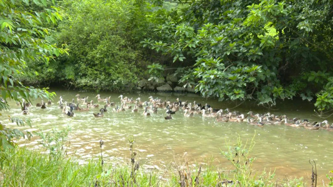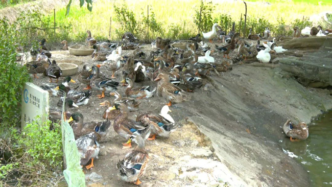 近日,记者来到龙茗镇西北村大草原养殖场,里面的鸭子有的在树荫下休息,有的在河中游泳,在赵桂荣发出喂食的呼唤声后,河中上百只鸭子像听懂了指令似的向岸边游来。