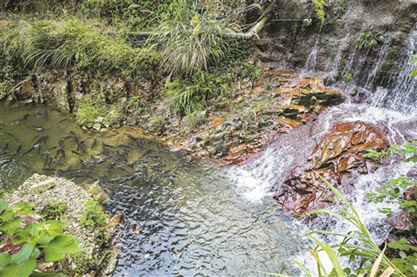 石窝鱼池内,成群的鱼缓缓游动。村民将甜象草一抛一撒,刚刚还平静的水面霎时动起来,鱼儿争相跃出水面争食。