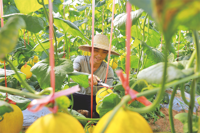 新江镇那云村村民在果蔬大棚种植示范基地的温棚里采摘甜瓜。