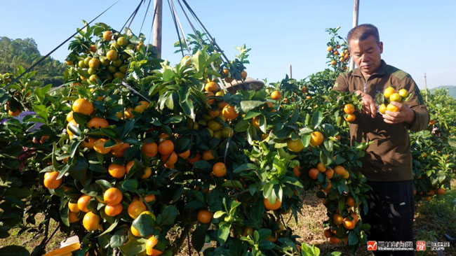 扶中村的卢文水果专业合作社果园里,金黄色的沙糖桔挂满了枝头。当天一大早,收购商和果园老板组织了20多名周边村民采摘沙糖桔,一担担挑到地头,有条不紊地分拣、装箱、装车,一派繁忙的景象。