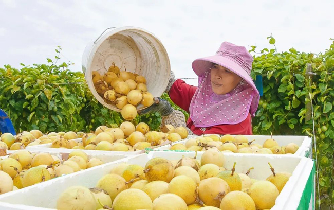 据悉,该基地种植的百香果产量高、个头大、果肉甜、耐存储,深受收购商和消费者欢迎。今年该基地的百香果产量预计达到25万公斤,采摘期将持续到元旦前后,产品陆续销往全国各地。
