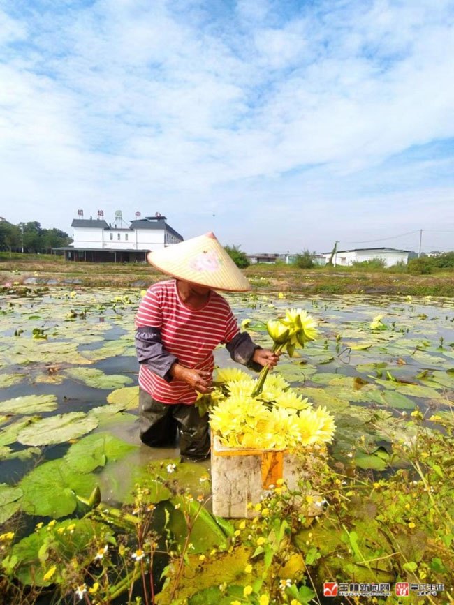安迪的圣田香水莲花基地,工人正在采摘莲花。