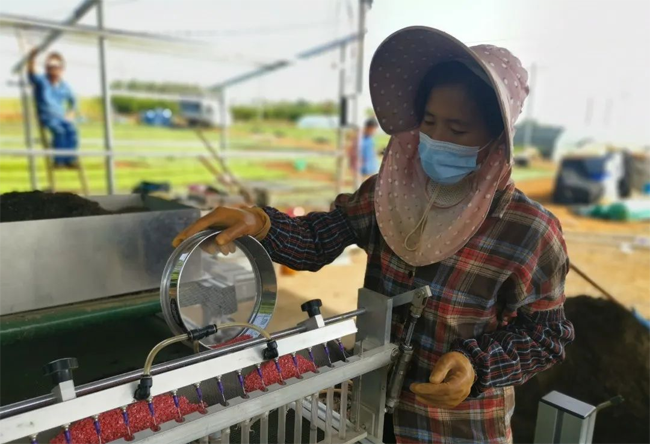 以前一盘苗要一个工人弄三四回才出苗,这个机器它就省了人工,我们就提高了效率。它一天可以完成几千盘,三四十盘一亩,大概可以出一百多亩。