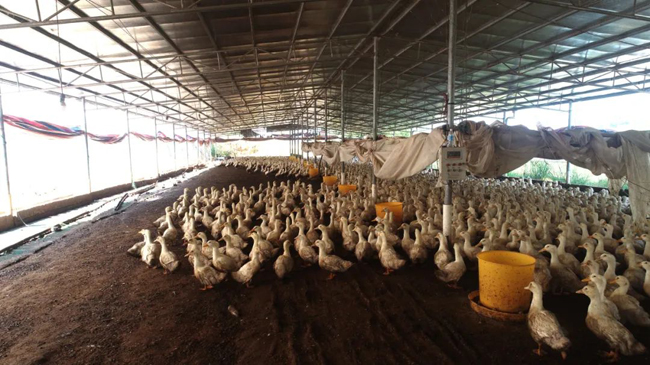 枯蒌村第一书记谢接锦:旱鸭养殖项目,是广西北港新材料有限公司按照北部湾港集团部署出资57万多元援建的养殖项目,项目占地3000多平方米,每年可饲养48000只左右,分6批饲养,每批养8000只左右,年效益有24万余元。通过“公司+合作社+养殖户”合作的旱鸭养殖发展模式,现在已辐射带动23户村民加入大棚养殖旱鸭和鸡等项目,累计每年能创收220万元。下一步我们计划通过鸭粪发酵成为有机肥料,探索实现循环经济的发展新模式,增加收益。