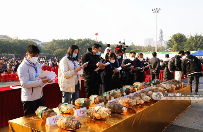经过激烈的角逐,最终荔浦学兴种植专业合作社获得荔浦芋王奖,广西荔浦桂蓝生态农业有限公司获最靓芋头奖,广西荔浦瑶妈妈农业科技有限责任公司获最粉芋头奖,荔浦学兴种植专业合作社获最香芋头奖,荔浦九道合作社获最糯芋头奖,广西妞妞农产品有限公司获最紫芋头奖,荔浦市修仁镇罗老二御芋缘家庭农场获最大芋头奖,荔浦学兴种植专业合作社荣获2022年荔浦芋争霸赛五星企业品牌团体奖。图为芋王评比现场。
