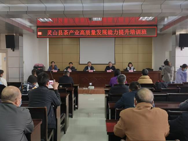 次日,茶科所主要负责人到灵山县农业农村局开展茶产业高质量发展能力提升培训班,灵山县农业农村局副局长作开班讲话。报告分析了当前我国、广西以及灵山发展现状和制约瓶颈问题,并就品种、加工、品牌、营销、文化等方面提出全方位高质量发展的意见建议。