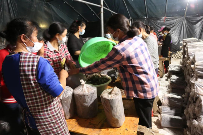 在罗富镇清溪园食用菌培植专业合作社发菌基地现场,只见20多名务工村民正在大棚下给菌棒接种,而隔壁的几个大棚里则堆满了填装好的菌棒,待菌棒发酵后再移往种植基地。