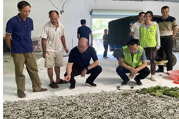 调研组一行首先察看了松山村集体投资建设的两栋总面积为700m2的设施蚕业项目,在听取了驻村第一书记介绍后,调研组指出该项目设计科学、选址良好,四面山坳环绕,农药污染风险低,小气候凉爽舒适,靠近桑园方便采叶,周边地势平坦开阔,具有极佳的发展潜力,要加快项目建设进度,尽早投产发挥助农增收作用。随后,调研组又到松山村巴敏屯调研蚕桑生产情况,与当地干部群众进行了深入交流,针对当前蚕季高温干旱的特点,指导养蚕户采取相应措施,保证蚕茧产量质量。