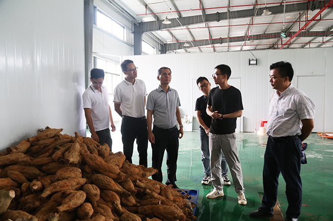 调研组一行先后来到藤县濛江镇广西藤县葛泰农业科技有限公司、和平镇大心坡粉葛种植基地以及和平镇粉葛研学中心,实地了解藤县粉葛产业在种植、产品深加工和销售等环节的特点和优势。