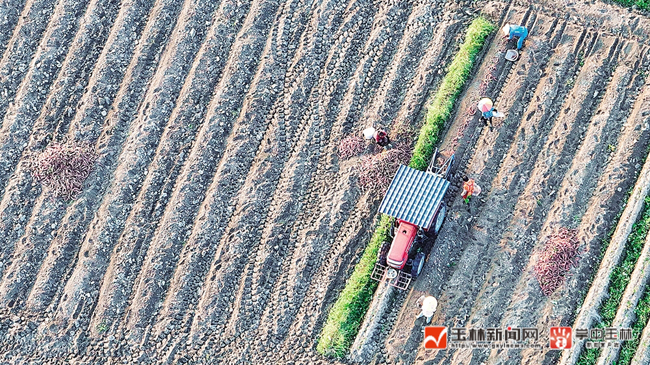 近日清晨,玉州区仁厚镇荔枝根村红薯种植基地里,拖拉机在前面开挖红薯,村民跟在后面捡起,分拣装袋。