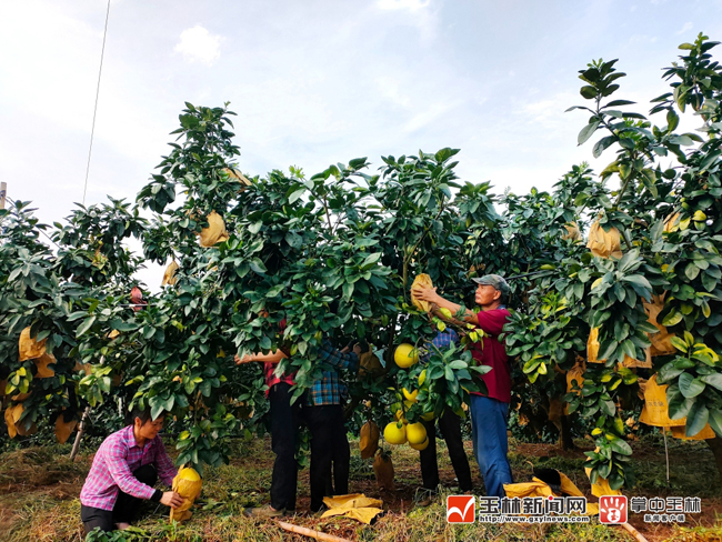 近日,笔者在容州镇、十里镇、县底镇、自良镇等众多果园里看到,柚子树郁郁葱葱,柚子树上挂满了金黄的果实,现场柚农们穿梭于果林间,正忙着将成熟的柚果除袋。容州镇果农黄广林介绍说:“除了口感一级棒,蜜柚的外观也很漂亮。因为在成熟前80天,就组织人员对柚子进行套袋装,这样在出品前就有效保证了颜色品相,同时蜜柚汁多肉嫩、香气浓郁,广受消费者的青睐。现在临近中秋节了,订单很可观,我们每天的订单量达100吨到200吨,蜜柚主要销往商超、一些电商平台和传统的批发市场。”