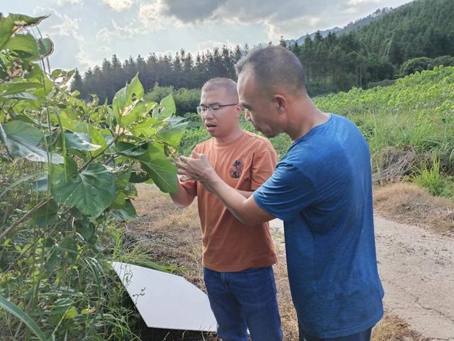 服务团在观音乡狮塘村养蚕基地,张志林认真查看了该批次上蔟结茧及蚕病防控情况,仔细调查了引进黄金茧饲养试验情况,对该基地负责人冯维礼在蚕房消毒、桑叶投喂、蚕病防控等工作给予了肯定。但是该基地桑园前期的病虫害防控工作不到位,存在重复使用同一种农药、导致现阶段整个桑园桑螟发生严重的情况,影响了下一批次蚕的饲养。如何做好桑螟的防控工作,服务团提出了建议:化学防治不要重复使用同一种农药,以免产生抗药性;可考虑使用性诱剂、黄板粘虫等方法诱捕成虫;冬伐桑枝全部烧毁,减少越冬虫口。