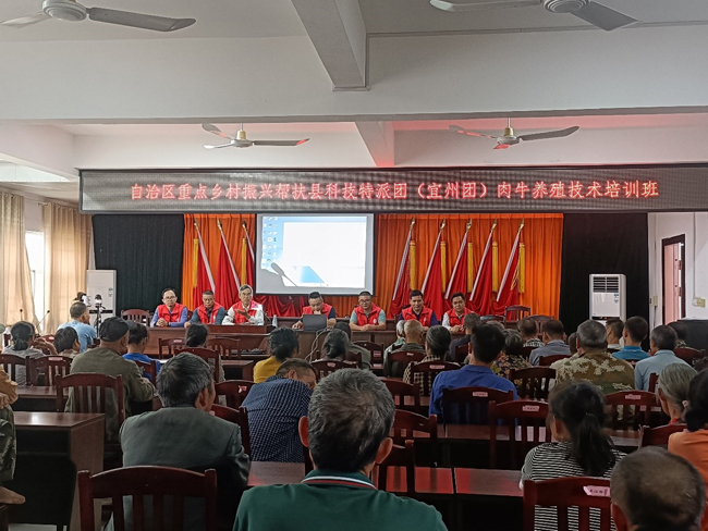 10月13-14日,自治区乡村振兴重点帮扶县科技特派团(宜州团)一行7人,到河池市宜州区福龙瑶族乡开展肉牛养殖技术培训。全乡70多位规模养牛重点户农民参加了这次培训活动。