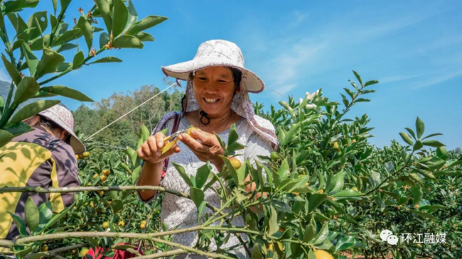 天气晴好,金桔飘香。近日,在环江毛南族自治县村集体经济扶贫产业园川山镇下久村1200亩脆蜜金桔种植基地,人头攒动,工人来回穿梭,采摘、分捡、外运,现场一派忙碌的景象。