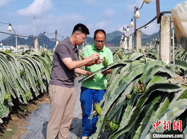图为江明岳(左)在和火龙果基地场长叶居鸿查看火龙果的长势。曲甲佳 摄