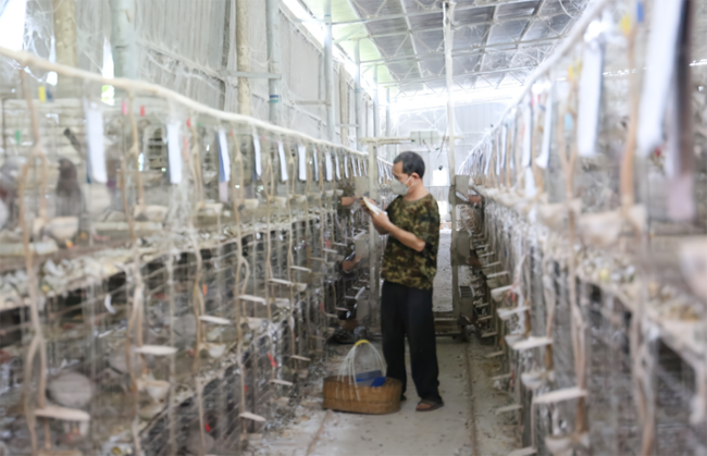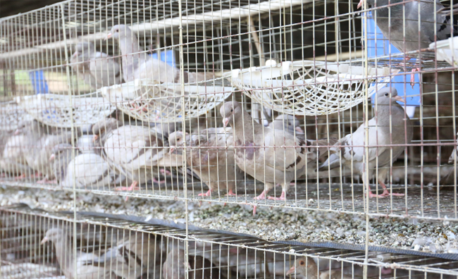 从饲料调配、疾病防治到粪便清理、联系销售,孔庆祖已经成了行家,他每天穿梭在一排排鸽笼之间,给鸽舍清理,检查每个鸽舍里鸽子的生长情况,随后又开始捡鸽子蛋准备进行下一步孵化工作,养鸽棚里一派忙碌景象。