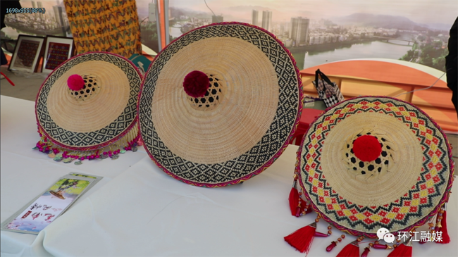 走进展销活动现场,人头攒动,热闹非凡。40余个展位上整齐摆放着花竹帽、傩面、牛肉干、米酒、脆蜜金桔等民族特产产品及非遗文创产品。身着特色民族服装的工作人员热情地向游客介绍自家的产品。