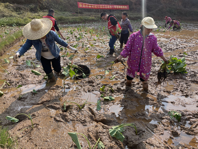 新龙村村干部与驻村队员积极引领村民投入芋苗种植。