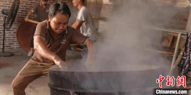图为工人使用传统方式蒸煮黑豆。受访者供图