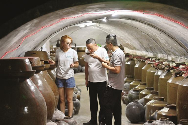 颜茜茜(左)和父亲颜建条(中)、广西科技大学生物与化学工程学院博士玉万国在公司酸笋水菌种库查看酸笋发酵情况(7月24日摄)