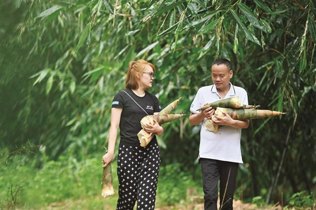 颜茜茜(左)和父亲颜建条在竹笋种植基地采收竹笋(7月23日摄)