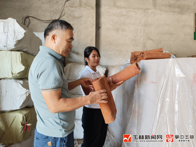 覃桂兰在自家收购点介绍肉桂品质。