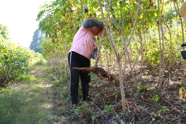 龙楼村塘茁庄村民莫琼芬正在自家的木薯地里查看木薯长势,只见她随手拔起一棵木薯,粗壮的茎杆、饱满的块茎,让人眼前一亮。看着手中的木薯,莫琼芬脸上洋溢着喜悦的笑容。