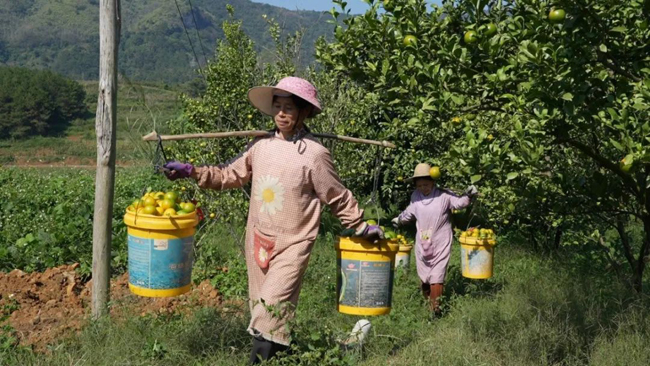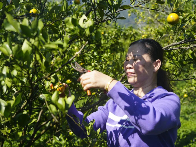 那桃乡民安村的村民黄阿姨表示,她们在这里采摘皇帝柑每天能赚100元。这份工作不仅离家很近,方便她们照顾家人,而且看到今年的收成如此好,她们在采摘时也感到非常开心。