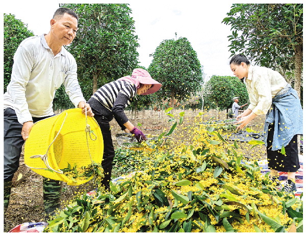 走进荔浦市双江镇永坪村桂花种植基地,只见工人们分工协作,有的忙着在桂花树下铺薄膜,有的不停地挥舞竹竿敲打桂花树,金灿灿的桂花如同雨点般纷纷落下。桂花经过筛选、装袋、过秤,最后装车,桂花园里充满了丰收喜悦的笑声。
