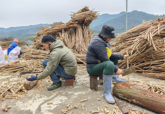 黄心木薯具有适应性强、产量高、市场需求稳定、经济价值较高等特点,并作为大菉镇发展乡村振兴特色产业之一,大菉镇政府积极向上级申请乡村振兴衔接资金10万元,选定高产、高附加值的“华南9号”黄心木薯作为特色种植品种,通过“公司+合作社+农户”的模式,村合作社与公司合作,流转周边村民连片撂荒地80亩,聘请本地农户帮忙种植,后期还会定期聘请村民进行除草、施肥、采收等工作,并优先覆盖脱贫户和低收入家庭,既充分将撂荒土地利用起来,又增加村集体经济收入,还能带动本地村民增收,实现了“一举多赢”的发展目标。