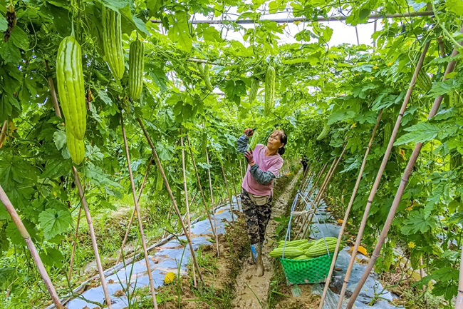 近日,兴宁区五塘镇约1.3万亩苦瓜陆续开始采收。走进西龙村道路两旁满是翠绿的苦瓜架子,青翠欲滴的胖苦瓜和鹅黄色的花朵掩映在葱葱郁郁的藤蔓间,丰收景象喜人。