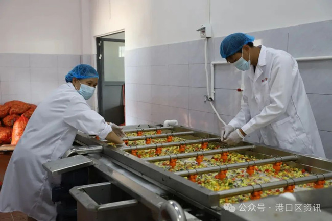 初夏时节,走进位于港口区光坡镇中间坪村的广西防城港旭馋食品科技有限公司,一派繁忙景象映入眼帘。一筐筐刚从地里采摘回来的五彩椒被倒入自动清洗机,红黄紫相间的辣椒在清澈的水流中翻滚跳动,宛如一幅流动的油画。