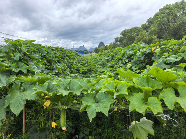 仲夏时节,平乐县阳安乡阳安村的毛节瓜种植基地绿浪翻涌,生机盎然。茂密的瓜藤纵横交织,织成一张巨大的绿网,网眼间垂挂着一个个青翠饱满、披覆细绒的毛节瓜,沉甸甸预示着丰年的喜悦。