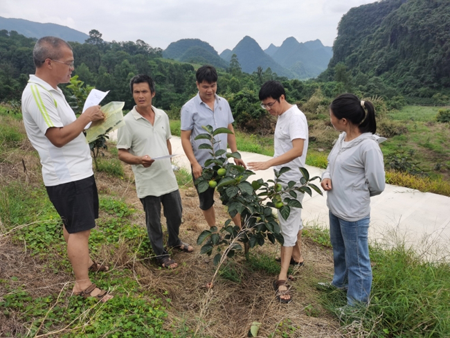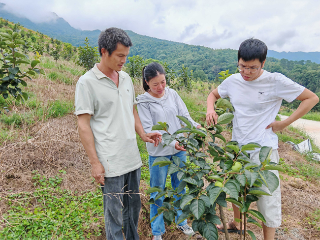 引优种,破瓶颈——瞄准高端市场,引进“太秋”这一兼具脆甜多汁、无涩早熟优势的新品种,建立标准化试种园。农技专家全程驻点指导,攻克桂北地区栽培适应性难关,实现技术突破。在三皇镇古城村永福县利铭种植专业合作社种植基地内,县水果站技术人员实地指导,与种植户一道探讨持果中后期树体水肥管理和病虫综合防治;在百寿镇王家胆屯太秋甜柿种植园,指导种植户进行拉枝整形,供肥壮苗。