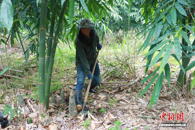 走进镇西村拉寨屯村民曾昭路的麻竹基地,只见他穿梭竹林间,快速锁定成熟的麻竹笋,手中铁铲精准一挥,“啪”的一声,一根裹着湿润泥土的麻竹笋便采收入袋。