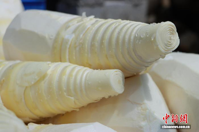 图为麻竹笋去皮后笋身洁白,挂着水珠。韦新娜 摄