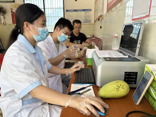 在诚信富硒水果种植专业合作社,该乡农业服务中心技术人员正对从各个种植户的果园中随机抽取的芒果样品开展检测工作。他们小心翼翼地将样品置于实验台上,按照标准化检验检测工作流程,首先对水果的外观进行详细检查,记录果实的色泽、大小、重量、有无病虫害等情况,随后使用定性定量精密检测仪器对样品进行农药残留检测,不放过任何可能存在的微量有害物质,全力守护消费者“舌尖上的安全”。