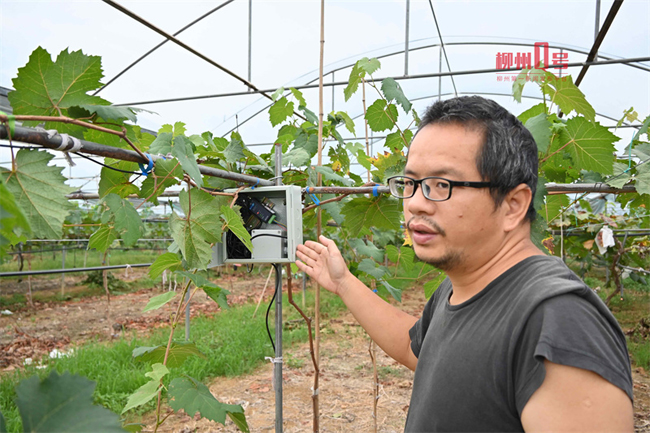 张阳杰介绍葡萄园里的传感器。