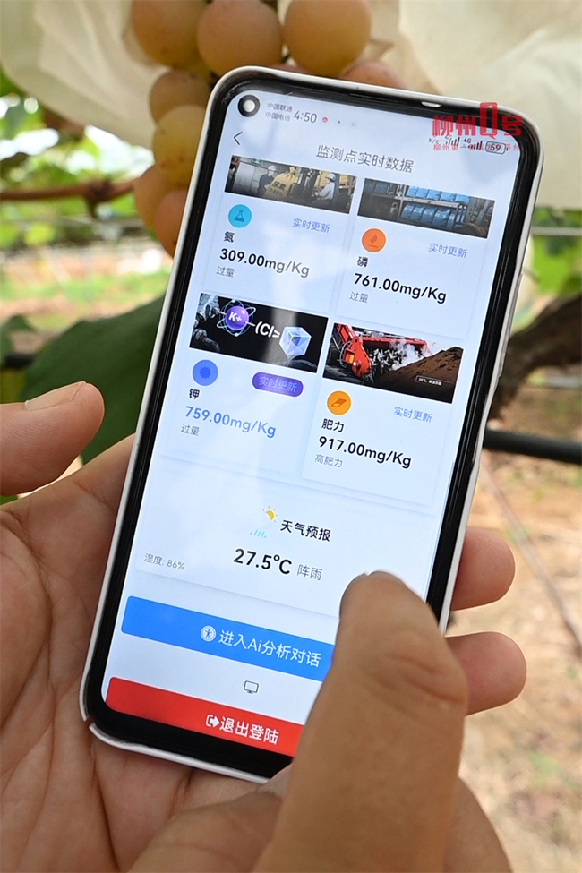 “系统显示土壤湿度为40.1%,葡萄根系适宜湿度为60%至80%,需要给葡萄浇水。钾含量为759毫克每千克,对于葡萄成熟期来说是正常的,因为它影响着葡萄的甜度和硬度。”张阳杰说着,用手捏了捏葡萄,顺手摘下一颗放进嘴里,“甜的,硬度也足”。