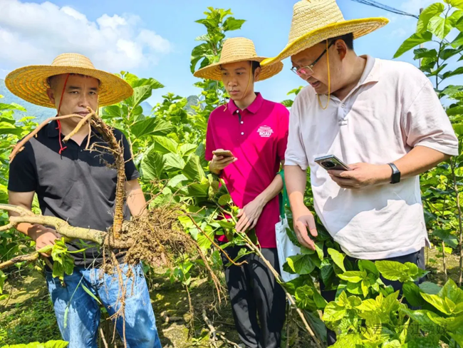 随后,专家团队前往桑树病害较为严重的田块开展实地调研。发现部分桑园存在病毒性萎缩病、桑叶褐斑病等问题,缺株、死株现象较为突出。经挖根查验,进一步确认该区域还存在根结线虫危害和紫纹羽病。针对上述问题,刘吉平教授提出一系列防治建议:对死株缺株区域可采用石灰粉消毒或施石灰氮后覆地膜,再补种抗病桑苗;桑树剪伐后应及时清园,全面使用蚕用消毒剂进行消杀;施肥应以有机肥为主,避免过量施用氮肥,同时加强桑园沟渠的修建与维护工作。“国家蚕桑专家的现场指导非常给力,对环江蚕桑产业的‘把脉’十分及时!”环江蚕业推广中心技术人员表示。