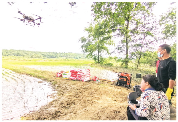 第一次见到蒋华林,是在今年6月中旬的一天。那时,正是早稻田间管护的紧要关头。当日早上,蒋华林和妻子蒋冬艳早早就开着一辆小型拖拉机从永岁镇石岗村出发,前往与石岗村相邻的梅潭村。拖拉机上,载着他们的“新家什”——一辆农用植保无人机。他们当日的任务,是给梅潭村90多亩的稻田施肥。